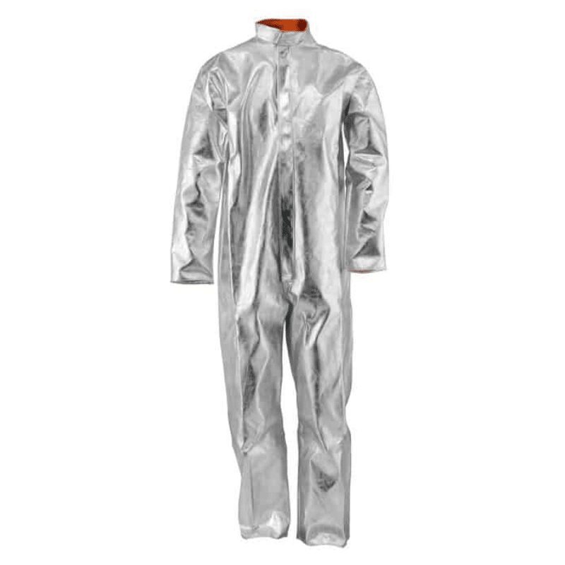 Tuta in tessuto di fibra aramidica alluminizzata 450 g/m² chiusura centrale con velcro e bottoni automatici rivestiti esternamente in tessuto aramidico alluminizzato, collo alla coreana. Cuciture tutte in filato di kevlar 50/3. Protezione per avvicinamento a fonti di calore, da brevi contatti con le fiamme e per i seguenti tipi di calore: convettivo, radiante, spruzzi di alluminio, spruzzi di ferro fuso, attività di saldatura e processi collegati con rischi equivalenti.