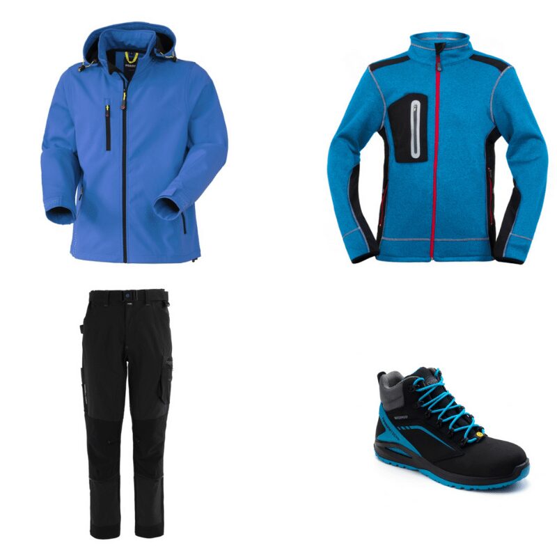 Calzatura alta in pelle di colore nero con membrana interna traspirante ed impermeabile, con tessuto grigio imbottito in zona caviglia ed applicazioni di colore azzurro ottanio. Fodera interna R-DRY antiodore di colore grigio ed azzurro ottanio, linguetta imbottita, puntale in fibra di vetro, lamina non metallica, soletta anatomica, traforata, con gel antishock sul tallone che assorbe gli urti, estraibile, traspirante ed antistatica.