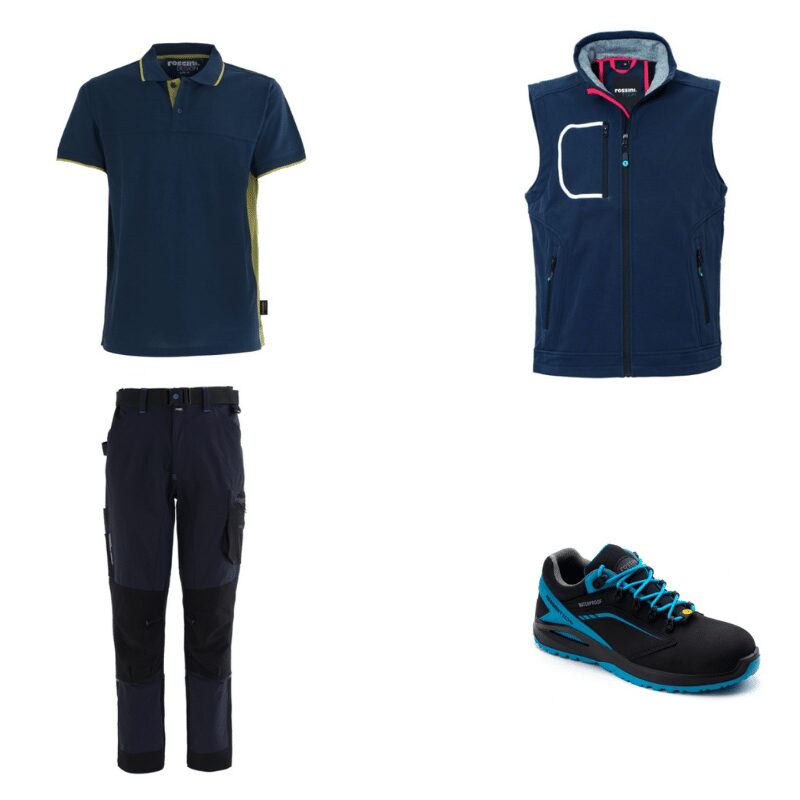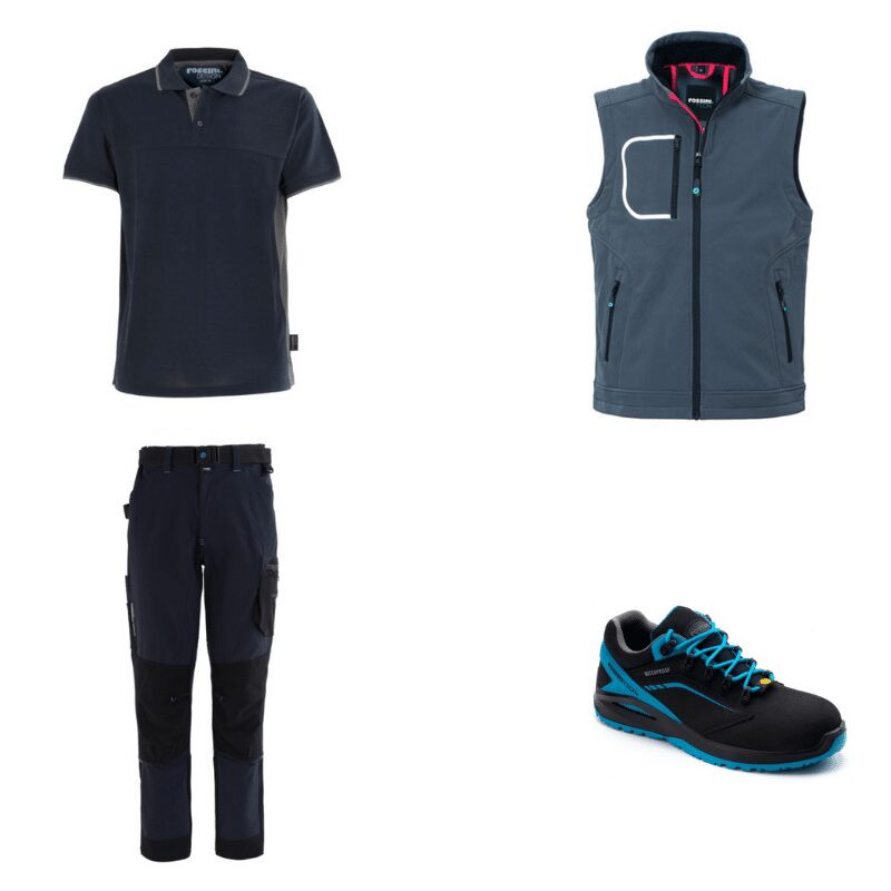 Calzatura bassa in pelle di colore nero con membrana interna traspirante ed impermeabile, con applicazioni di colore azzurro ottanio. Fodera interna R-DRY antiodore di colore grigio ed azzurro ottanio, linguetta imbottita, puntale in fibra di vetro, lamina non metallica, soletta anatomica, traforata, con gel antishock sul tallone che assorbe gli urti, estraibile, traspirante ed antistatica.