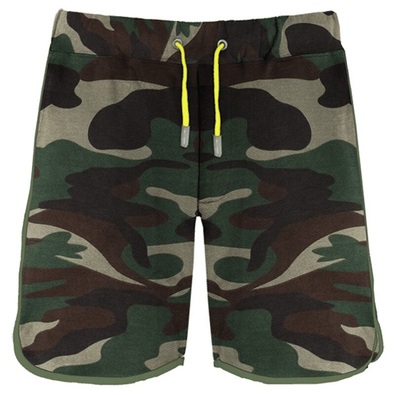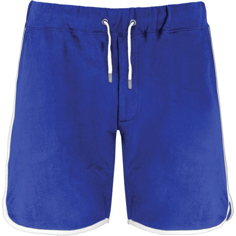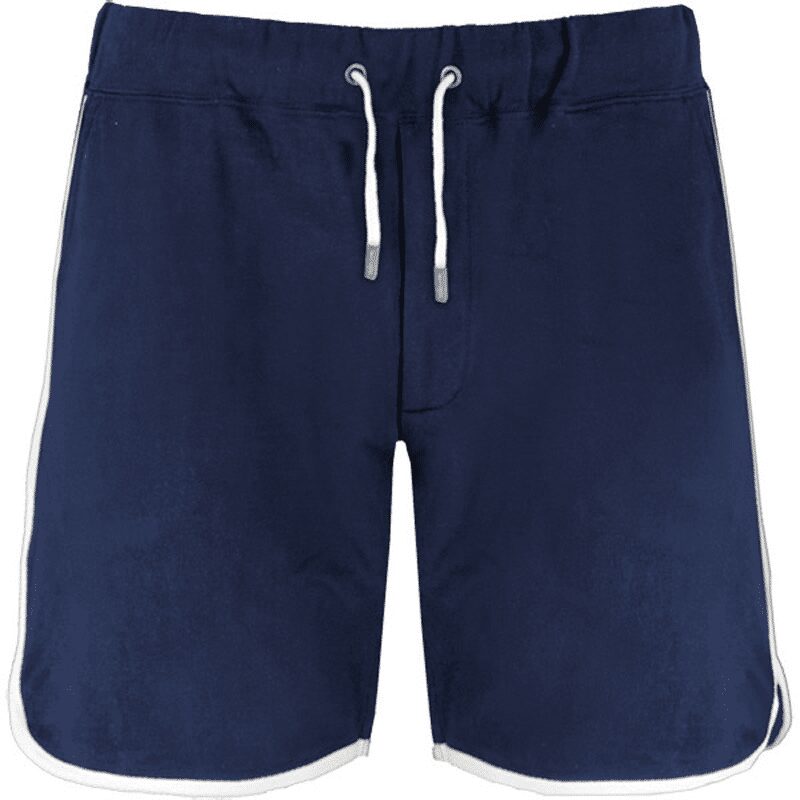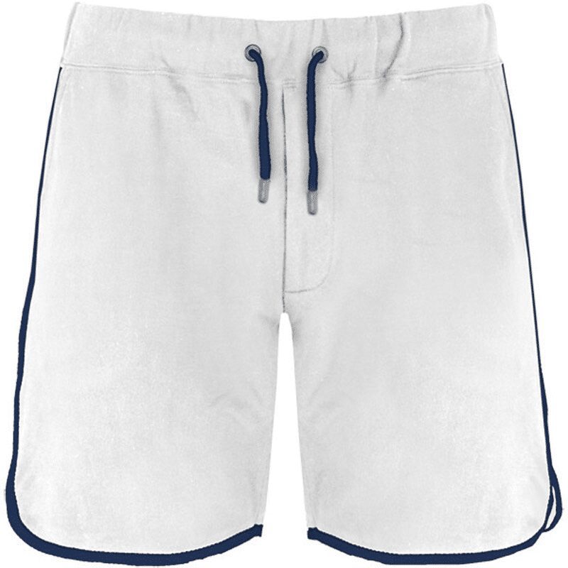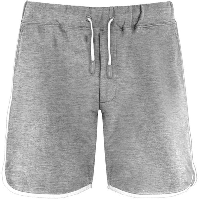 Bermuda uomo in felpa, elastico e coulisse in vita, patta con zip, due tasche frontali e bordino di finitura a contrasto.