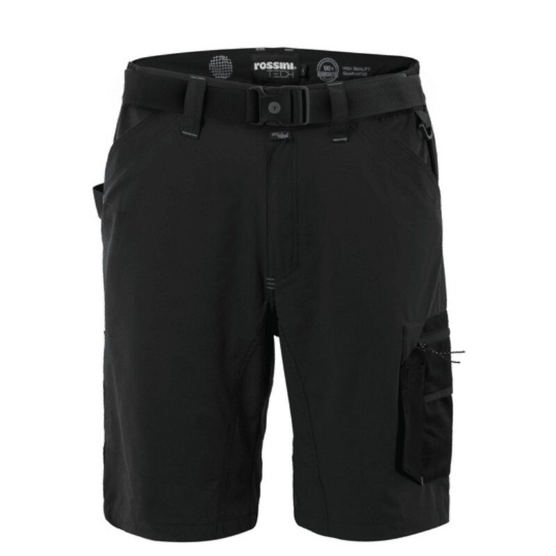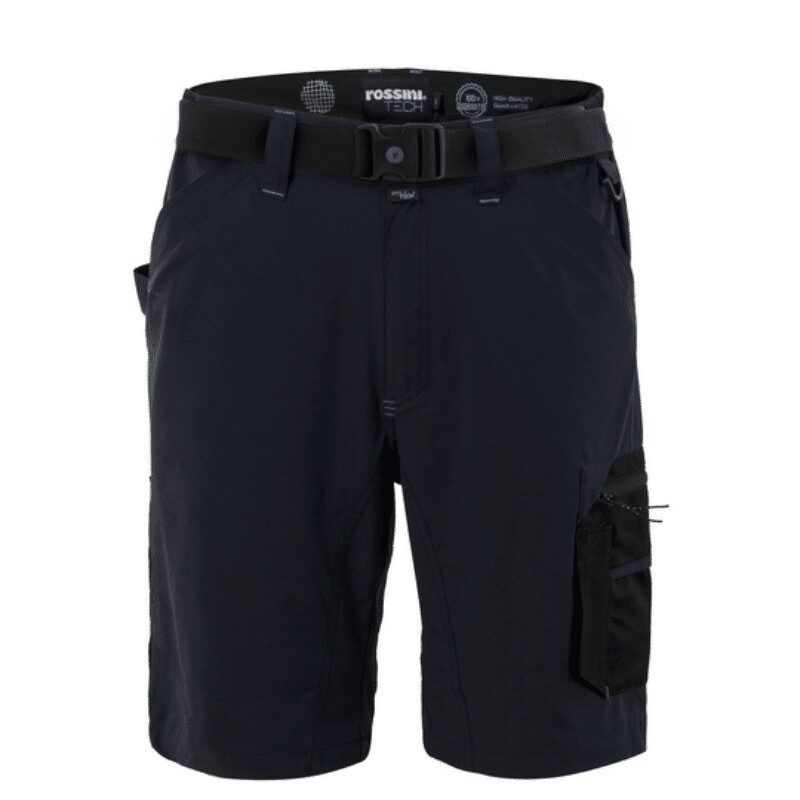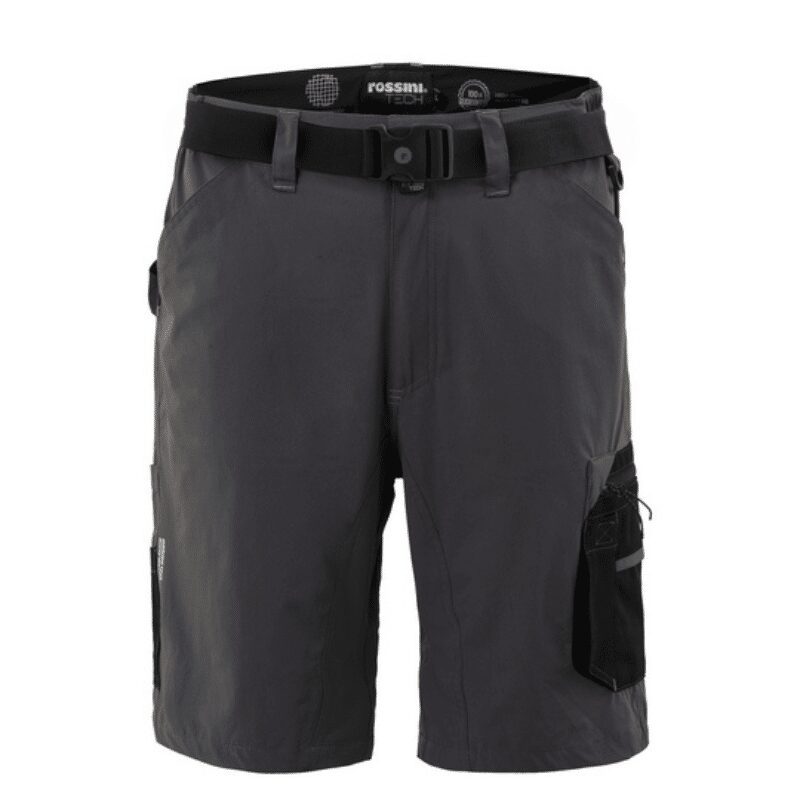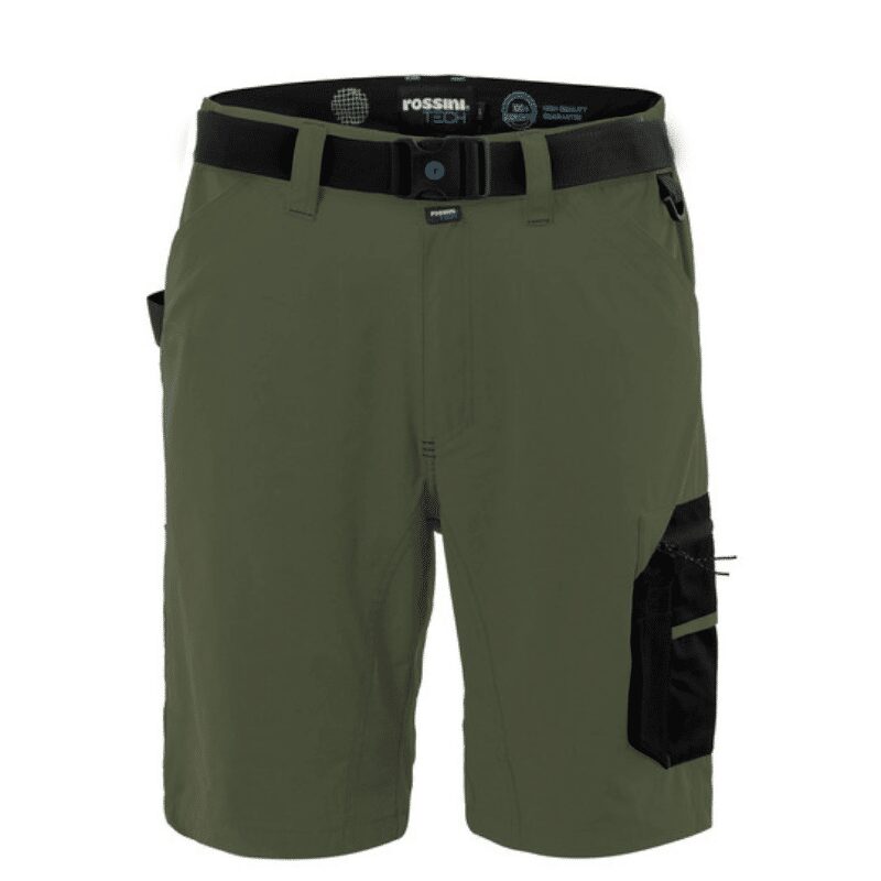 Bermuda da lavoro in tessuto stretch nelle quattro direzioni, ultraleggero e traspirante, elastici laterali in vita e passanti, inserto in rete di colore a contrasto nella zona renale. Chiusura alla patta con zip e bottone in metallo con finitura effetto rame. Pratica cintura estraibile in poliestere, regolabile con fibbia a chiusura automatica.