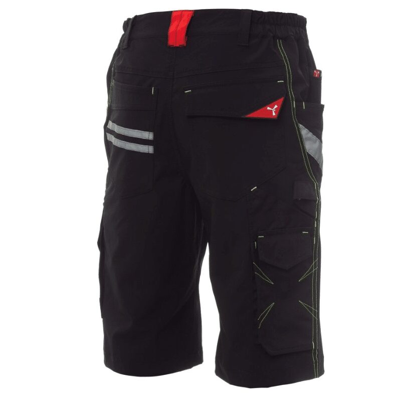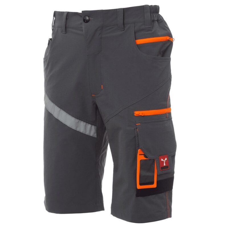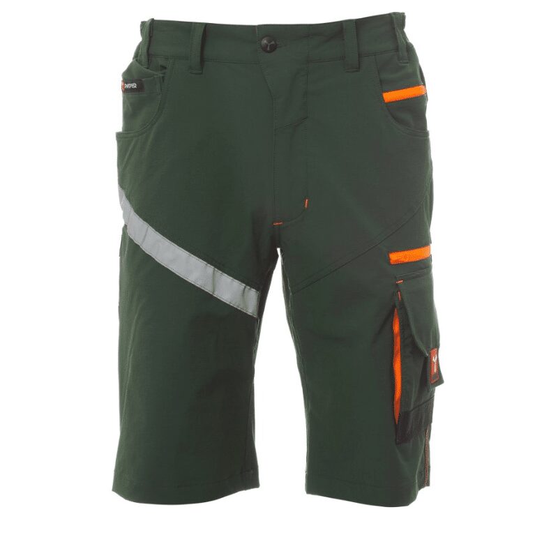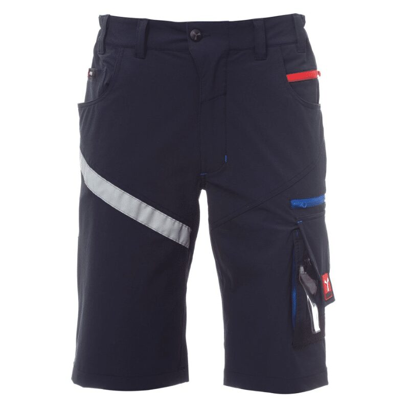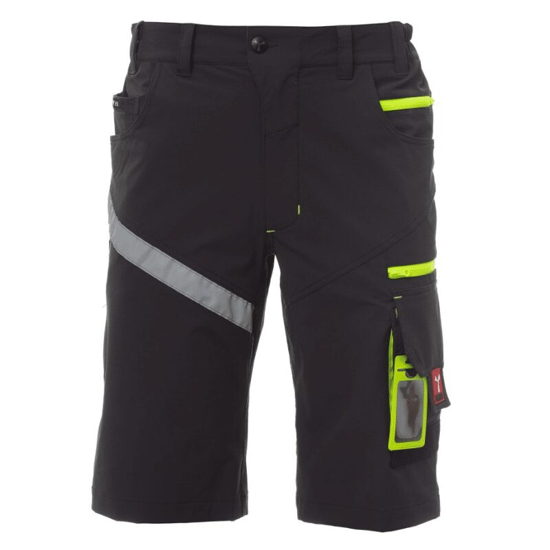 Bermuda unisex, tessuto “4 way stretch”, con elastici laterali e passanti in vita, chiusura con zip e bottone personalizzato. Sul davanti ha due tasche arrotondate, un taschino porta monete a destra, un taschino di sicurezza chiuso con zip a sinistra. Sul fronte della gamba sinistra presenta 3 tasche: una tasca orizzontale chiusa da una zip, una tasca con patta sagomata chiusa con velcro e dotata di portabadge, una tasca piccola verticale chiusa con zip. Sul fronte della gamba destra è presente una banda retroriflettente. Sul retro sono presenti: una tasca con pattina chiusa con velcro e una tasca senza pattina ma con 2 bande retroriflettenti, un anello porta martello (gamba destra), una tasca aperta porta-metro (gamba destra) e una tasca porta-telefono con patta e velcro (gamba destra). Sono presenti anche impunture laterali e travette di rinforzo a contrasto in vari punti. Le taglie (italiane) centrali 48-50-52 hanno un interno gamba di 31 cm.