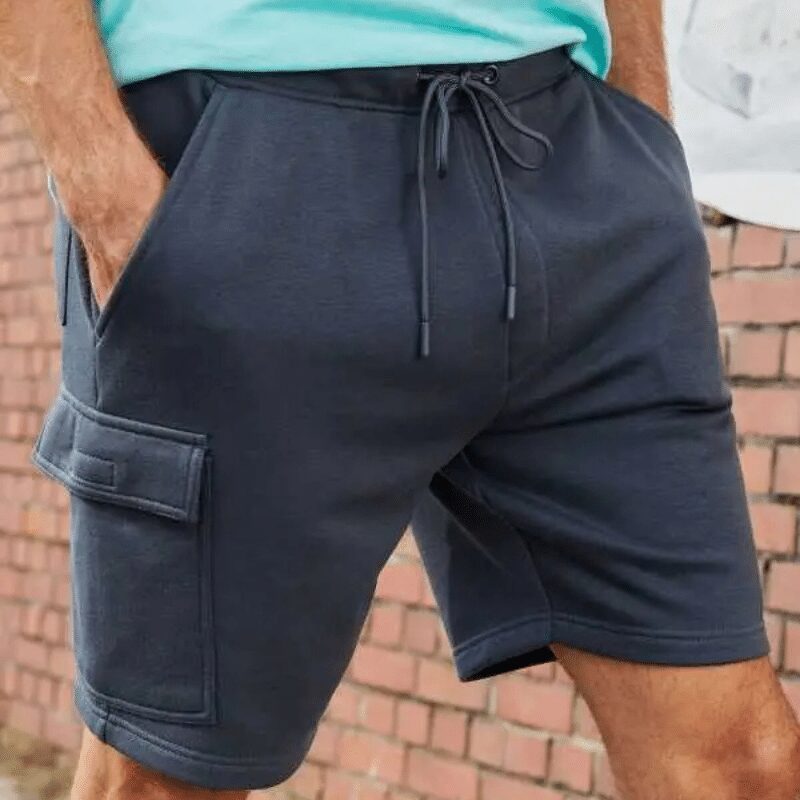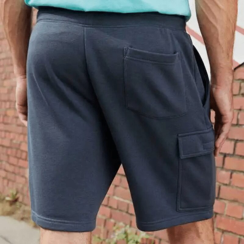 Pantaloncini corti in felpa stile cargo, French Terry di alta qualità, vita elasticizzata con cordino, 2 tasche laterali, 1 tasca posteriore, 1 tasca cargo con chiusura in velcro sulla gamba destra.