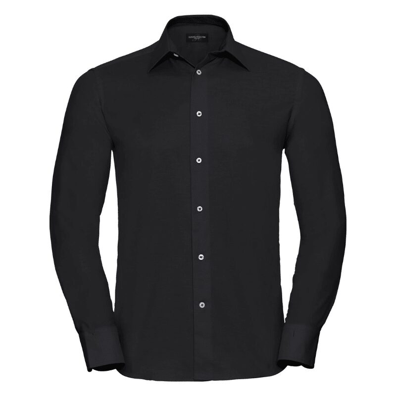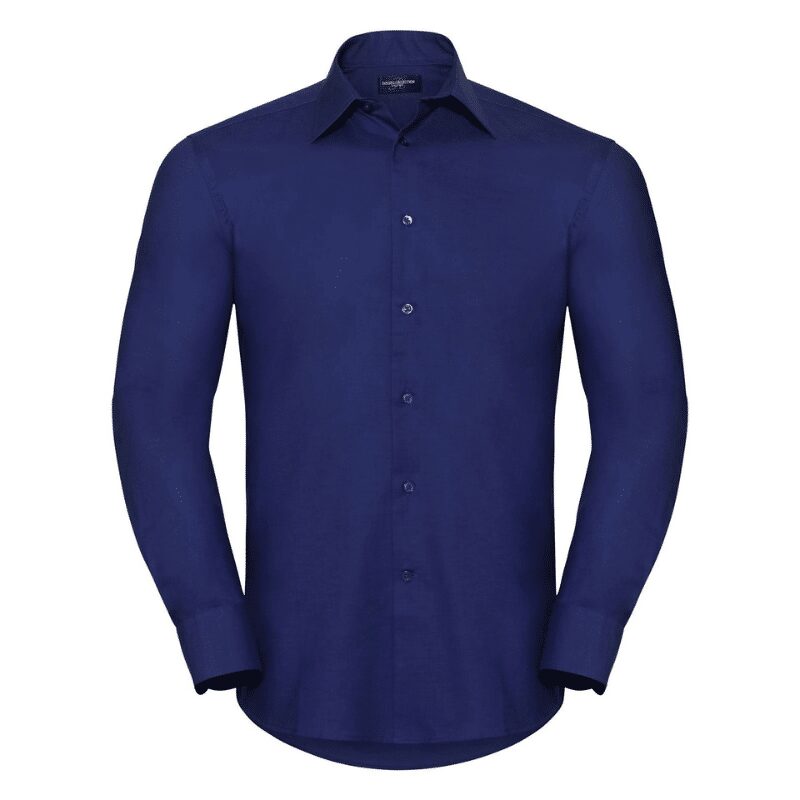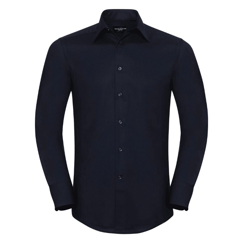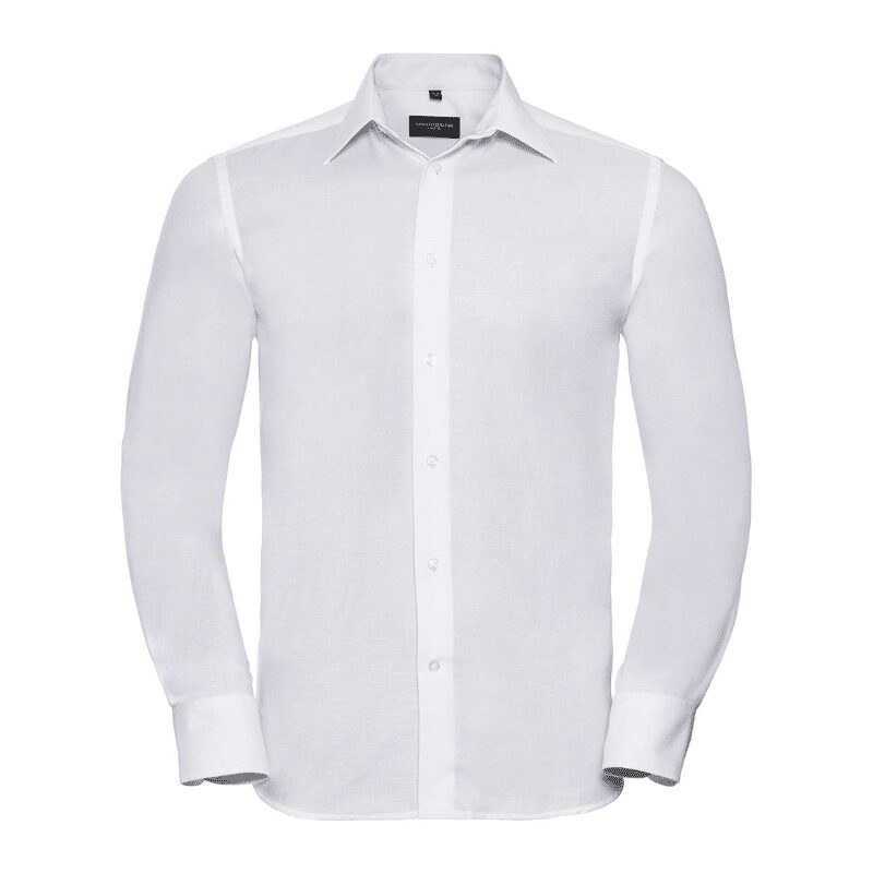 Camicia uomo manica lunga con colletto semi francese con stecche, polsino regolabile con due bottoni e occhiello per gemelli, orlo stondato, bottone di ricambio.