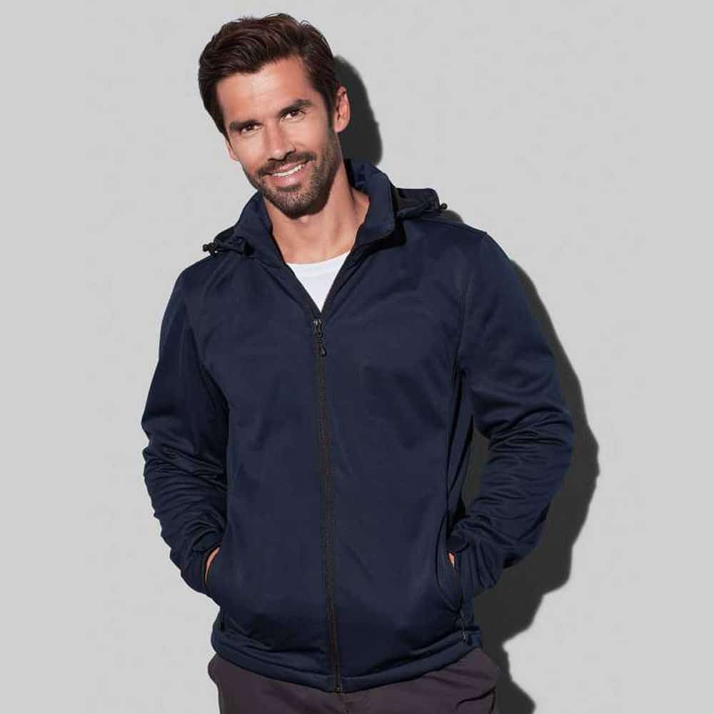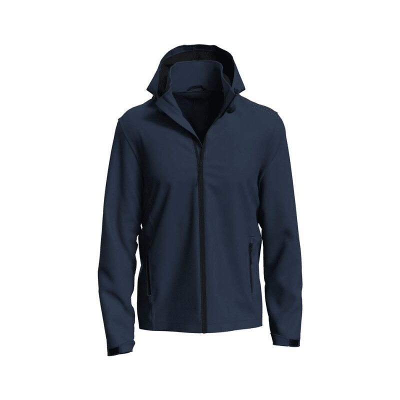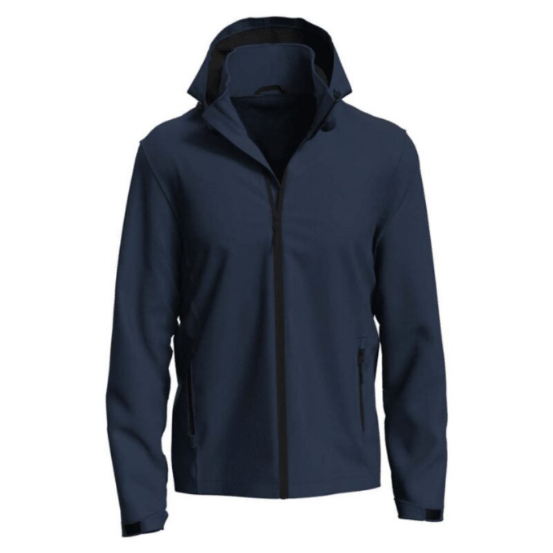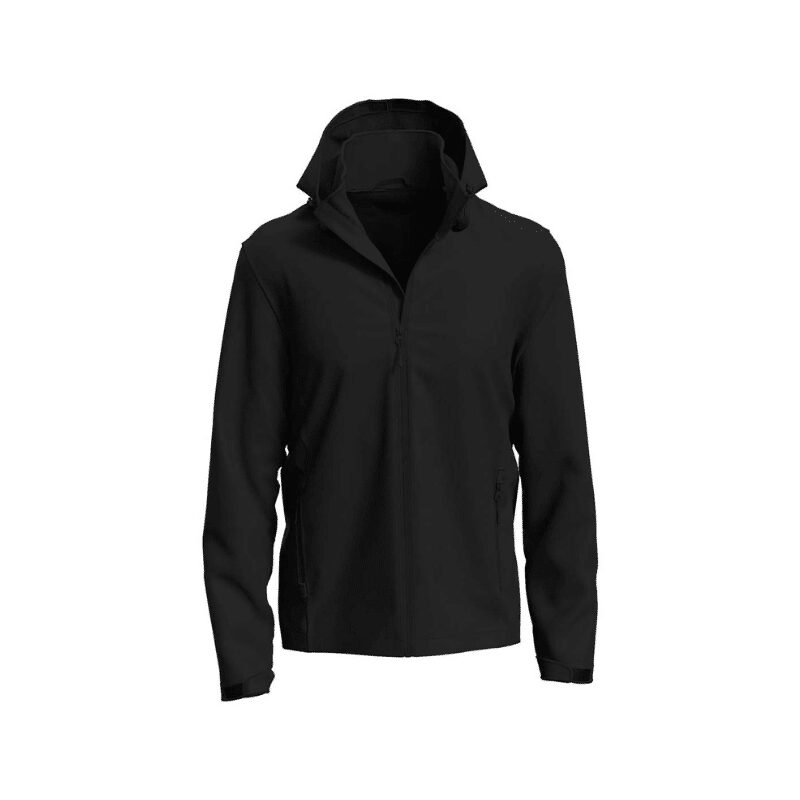 Giacca softshell uomo con tessuto a 3 strati impermeabile (5.000 mm) e traspirante (1.000 g/m²), mezzaluna centrale posteriore per la personalizzazione, polsini e orlo regolabili, tasca interna, cappuccio rimovibile e regolabile, 2 tasche laterali con cerniere di alta qualità, bordo di protezione dal vento, etichetta Premium con la taglia tessuta sulla nuca, ed etichetta di manutenzione a strappo nella cucitura laterale, senza fluoro e PFC.