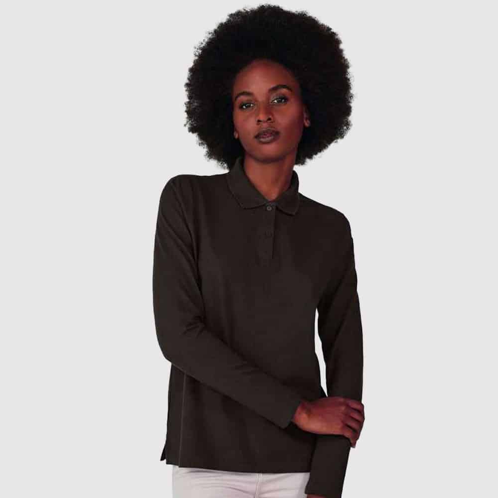 Polo donna maniche lunghe senza tempo, classica, moderna e facile da indossare, realizzata in tessuto di alta qualità, 2 bottoni tono su tono, polsini a costine 1×1. Questo piqué fine ad alta densità offre una sensazione morbida al tatto e un’eccezionale stampabilità.