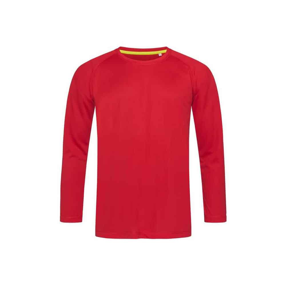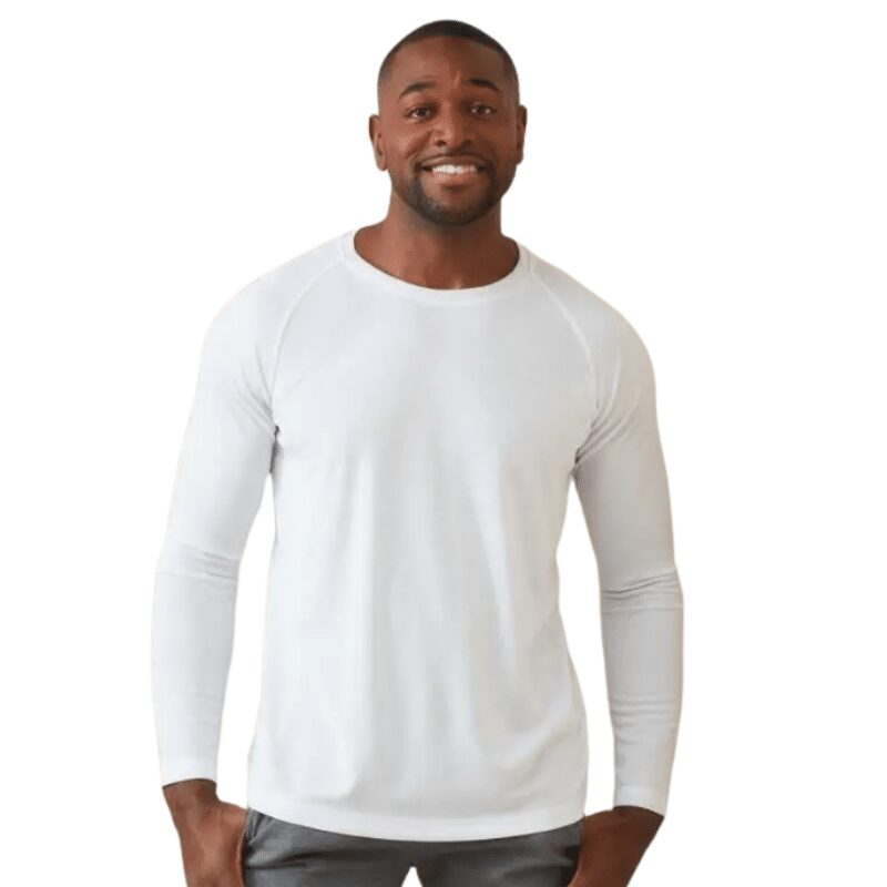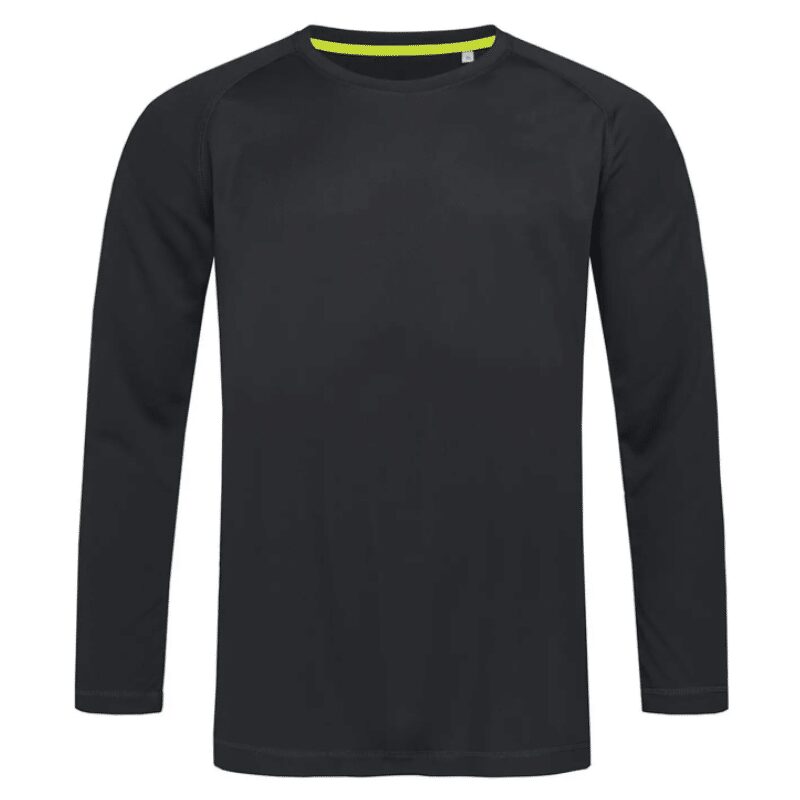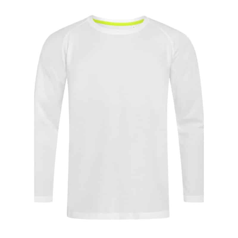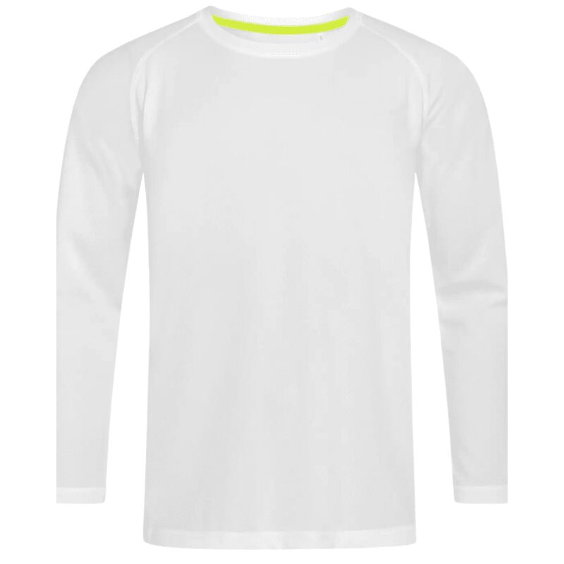 T-shirt manica lunga girocollo con cuciture laterali per un taglio attillato moderno e colletto basso in LYCRA® , nastro di rinforzo da spalla a spalla su misura per una maggiore stabilità, superficie liscia per un migliore risultato di stampa, piccola etichetta senza logo sul collo.