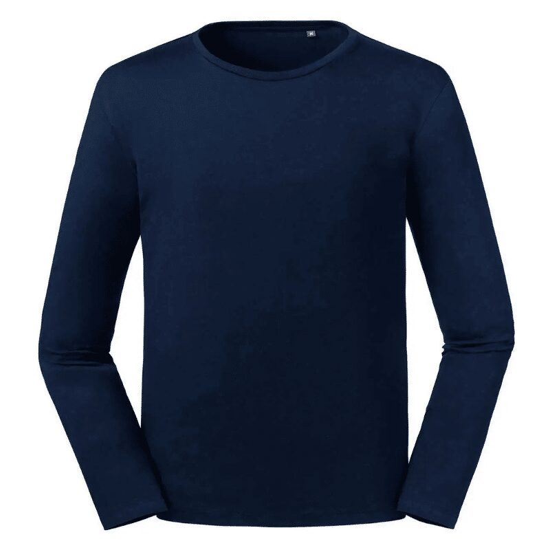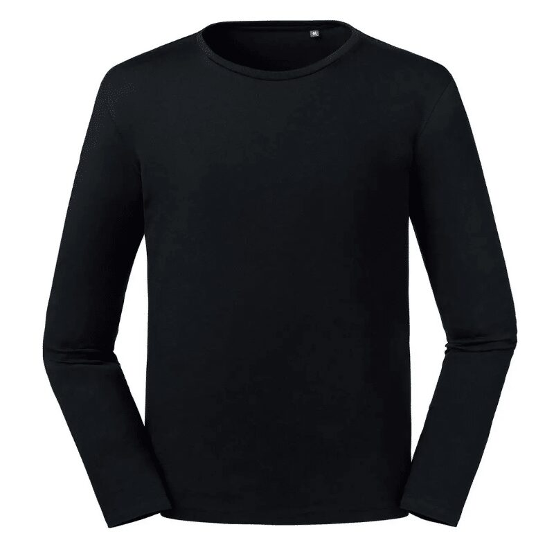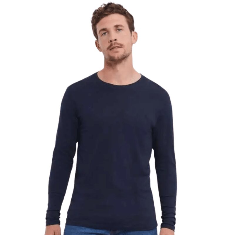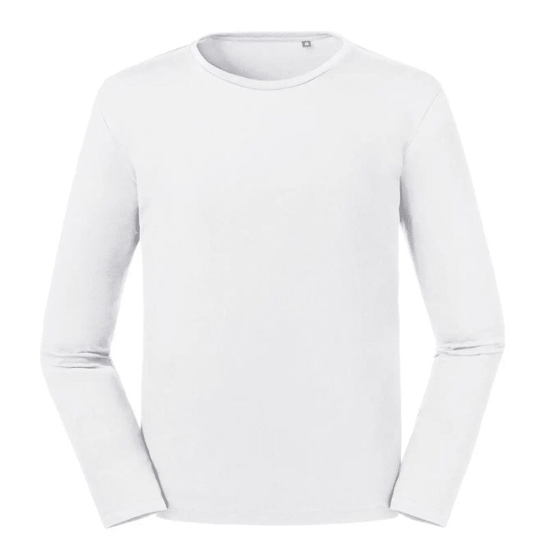 T-shirt manica lunga girocollo con cuciture laterali per un taglio attillato moderno e colletto basso in LYCRA® , nastro di rinforzo da spalla a spalla su misura per una maggiore stabilità, superficie liscia per un migliore risultato di stampa, piccola etichetta senza logo sul collo.